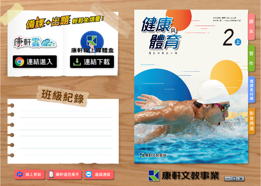 112學年上學期 國中 康軒版 健康與體育電子書 2年級(含課本、習作含解答、教學資源)教學光碟